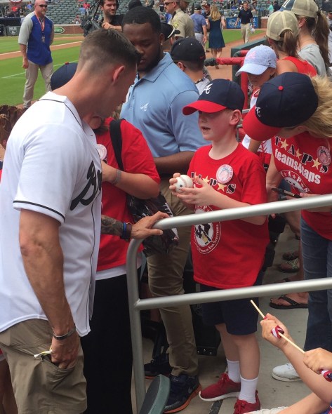 This veteran, Johnny “Joey” Jones, threw out the first pitch at the Braves/Mets game. He lost both of his legs above the knee and suffered damage to his right forearm and both wrists when he stepped on an IED in Afghanistan. His job was to disarm and dispose of IEDs. While walking off the field a mother thanked him for his service telling him that she had lost her husband Tom Kennedy in the war. He immediately offered the first pitch ball to her son. I was lucky enough to be sitting close enough to witness this. Truly amazing and inspiring as to what kindness, giving, and selflessness really look like. I’m honored I got to watch this moment.